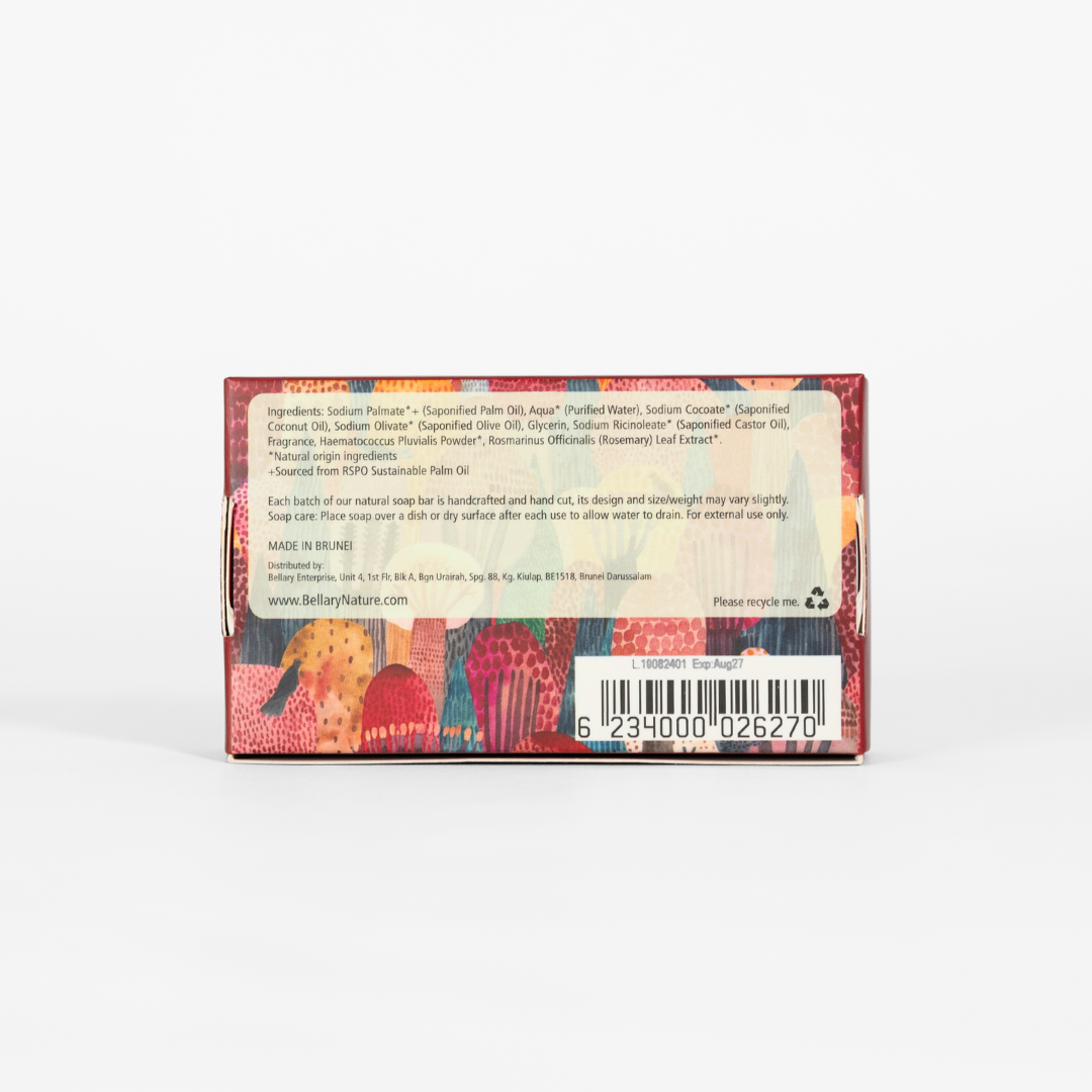 | Ingredients / Composition | Ingredients: Elaeis Guineensis (Palm) Oil*+, Aqua* (Purified Water), Cocos Nucifera (Coconut) Oil*, Olea Europaea (Olive) Fruit Oil*, Sodium Hydroxide, Ricinus Communis (Castor) Seed Oil*, Fragrance, Haematococcus Pluvialis Oil*, Rosmarinus Officinalis (Rosemary) Leaf Extract*. |