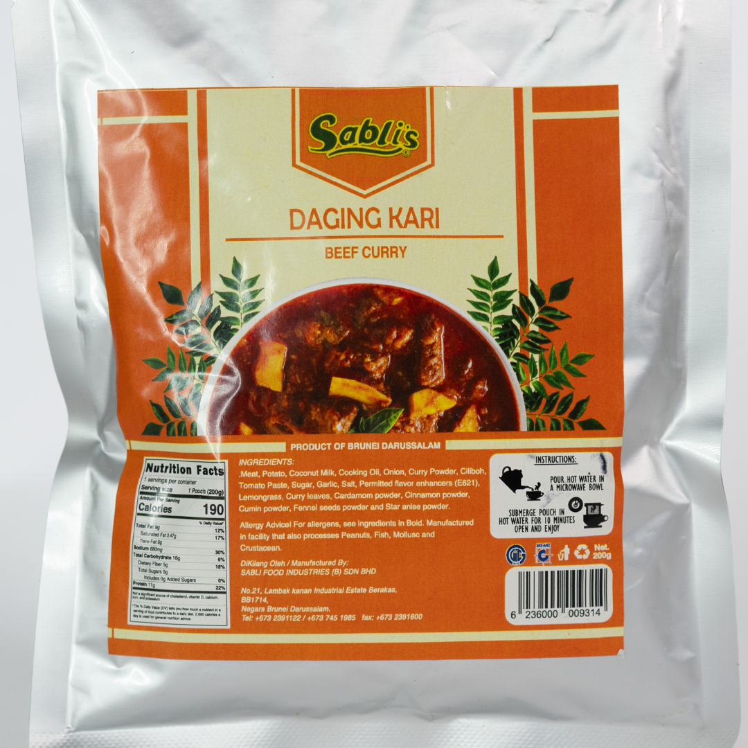 | Ingredients / Composition | Meat, Onion, Potato, Curry Powder, Dry Chili, Cooking Oil, Coconut Milk, Tomato Paste, Sugar, Permitted Flavour Enhancers (E621), Garlic, Lemongrass, Salt, Curry Leaves, Cardamom, Cinnamon, Cumin, Fennel Seeds, Star Anise, and Permitted Thickening Agent (E407) |