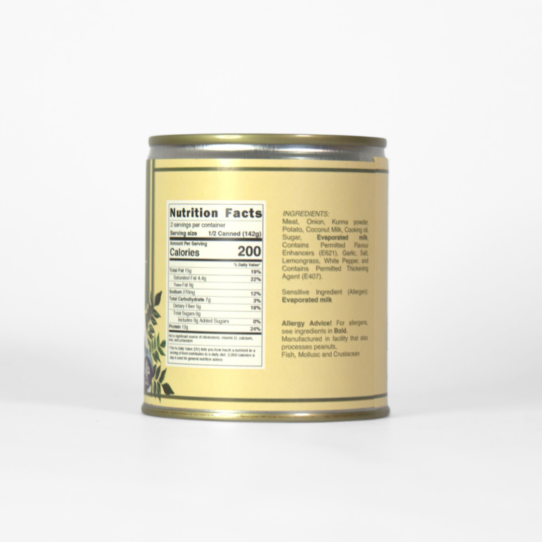 | Ingredients / Composition | Meat, Onion, Kurma Powder, Potato, Coconut Milk, Coconut Oil, Sugar, Evaporated Milk, Permitted Flavour Enhancers (E621), Garlic, Salt, Lemongrass, White Pepper and Permitted Thickening Agent (E401) |