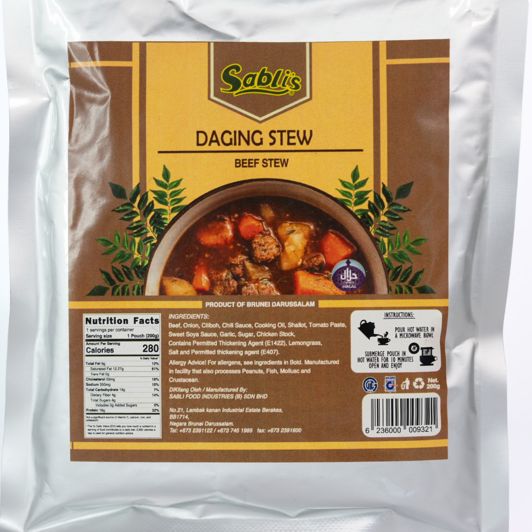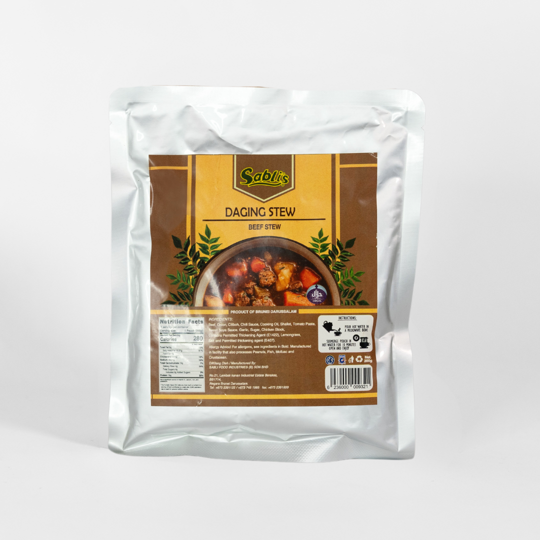 | Ingredients / Composition | Beef, Water, SHallot, Onion, Ciliboh, Chili Sauce, Cooking Oil, Garlic, Tomato Paste, Sweet Soya Sauce, Potato Starch, Sugar, Chicken Stock, Lemongrass, Salt |
