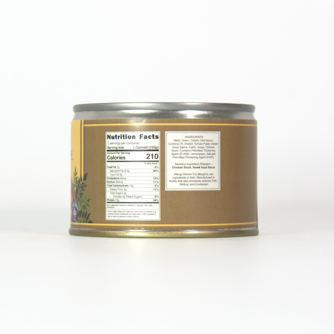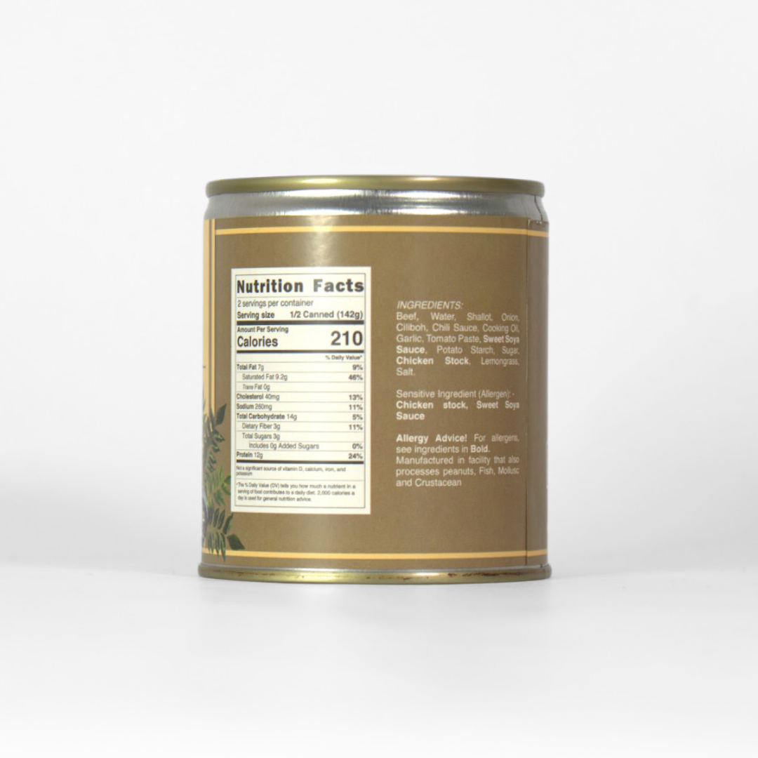 | Ingredients / Composition | Beef, Water, Shallot, Onion, Ciliboh, Chili Sauce, Cooking Oil, Garlic, Tomato Paste, Sweet Soya Sauce, Potato Starch, Sugar, Chicken Stock, Lemongrass, Salt |