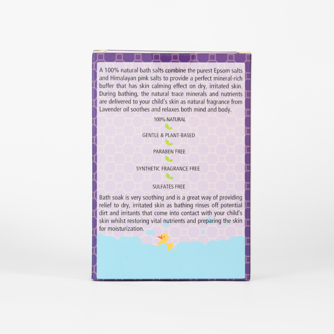 | Ingredients / Composition | Magnesium Sulfate (Epsom Salts), Sodium Chloride (Himalayan Pink Salts), Centella Asiatica (Gotu Kola) Extract, *Lavandula Angustifolia (Lavender) Oil, *Pelargonium X Asperum (Rose Geranium) Oil, Sodium Bicarbonate (Baking Soda) |