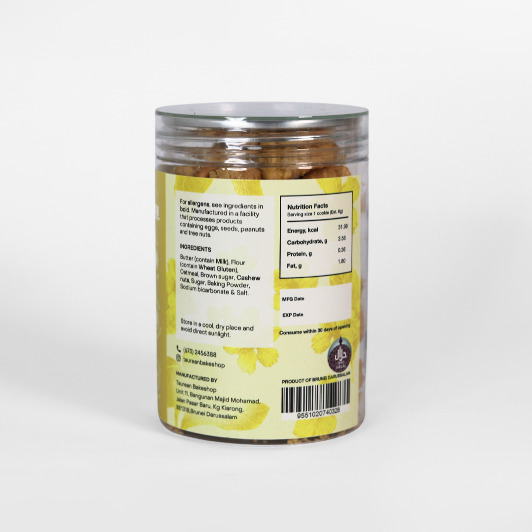 | Ingredients / Composition | Butter (contains milk), flour (contains wheat gluten), oatmeal, brown sugar, white sugar, cashew nuts, baking powder, sodium bicarbonate & salt. |