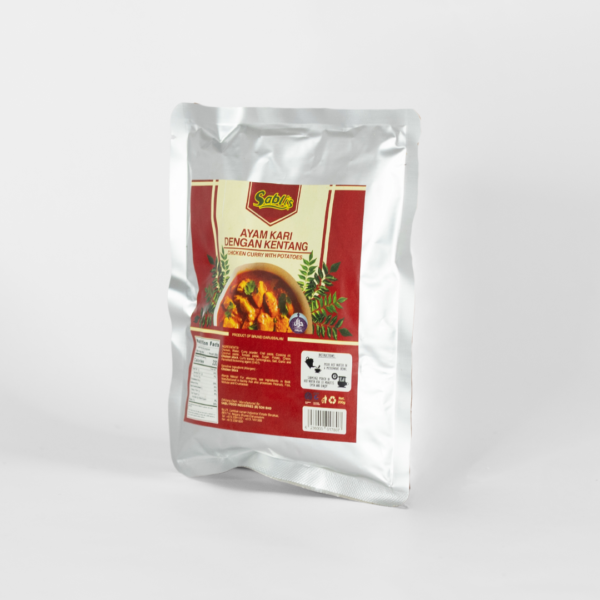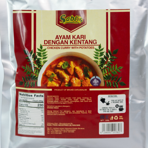Ingredients / Composition | Chicken, Water, Curry Powder, Chili Paste, Cooking Oil, Coconut Paste, Tomato Paste, Sugar, Potato, Onion, Chicken Stock, Curry Leaves, Lemongrass, Salt, Garlic and Permitted Thickening Agent (E407) |