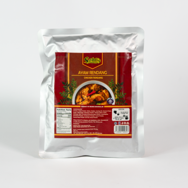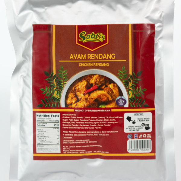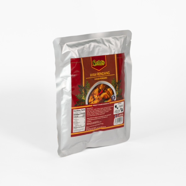 Ingredients / Composition | Chicken, Water, Kerisik, Ciliboh, Coconut Paste, Rendang Powder, Sugar, Cooking Oil, Brown Sugar, Onion, Shallot, Chickens Stock, Galangal, Salt, Garlic, Lemongrass, Cinnamon Powder, Star Anise Powder, Cardamom Powder, Fennel Seeds Powder, Cumin Seeds Powder, and Permitted Thickening Agent (E407) |