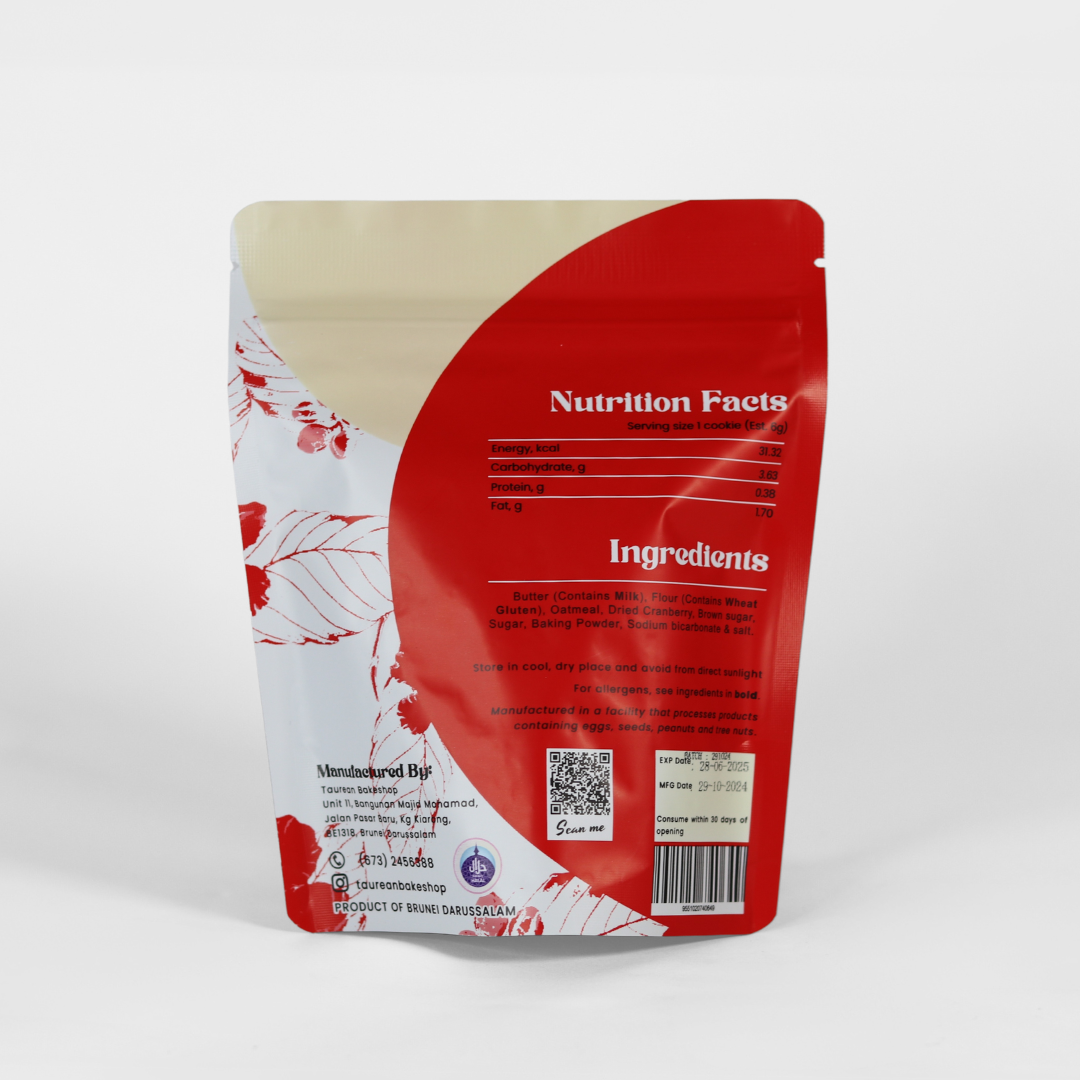 | Ingredients / Composition | Butter (contains milk), flour (contains wheat gluten), oatmeal, dried cranberries, brown sugar, white sugar, baking powder, sodium bicarbonate & salt. |