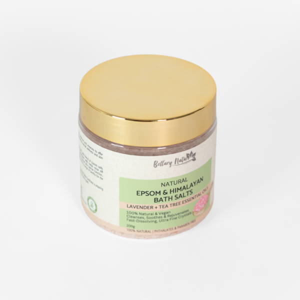 Magnesium Sulfate (Epsom Salts), Sodium Chloride (Himalayan Pink Salts), Sodium Bicarbonate (Baking Soda), *Melaleuca Alternifolia (Tea Tree) Leaf Oil, *Lavandula Angustifolia (Lavender) Oil, *Pelargonium X Asperum (Rose Geranium) Oil