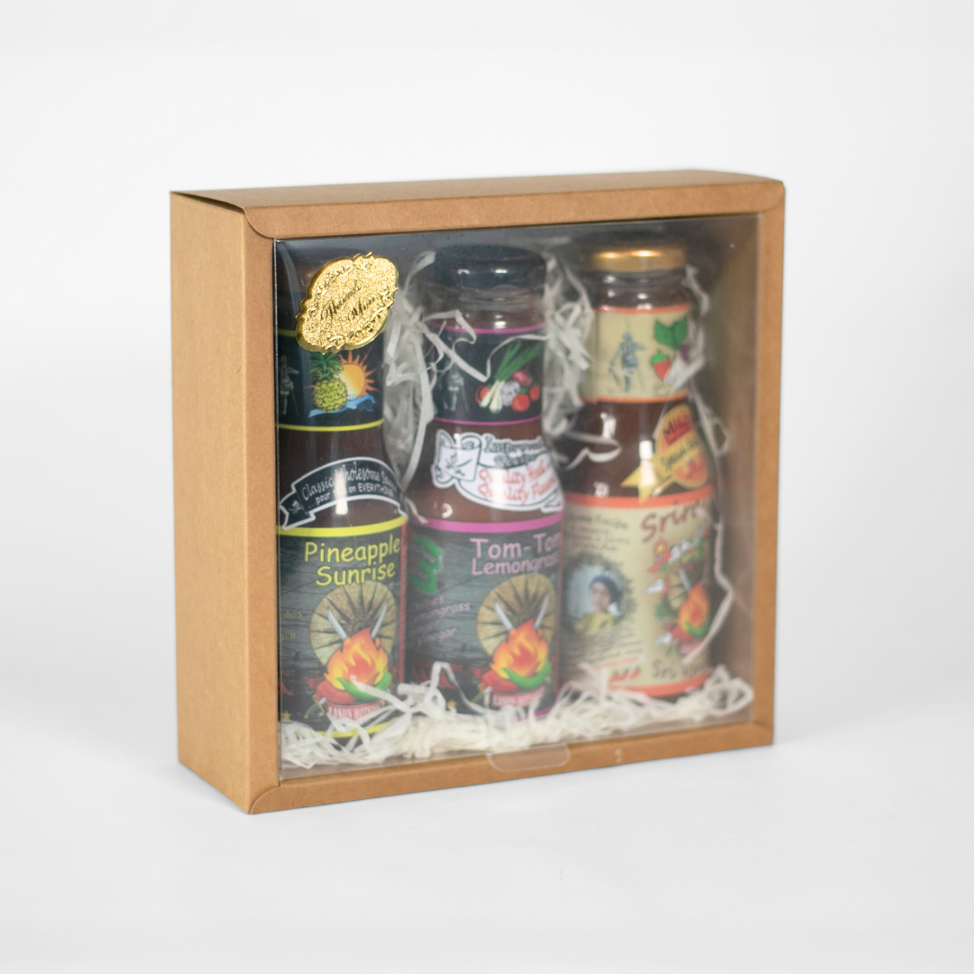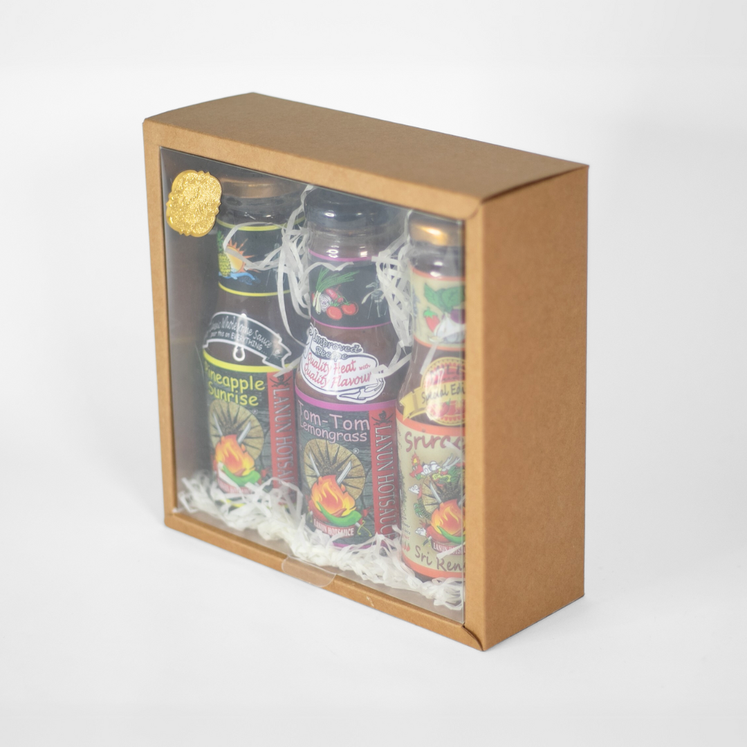 These Gift Pack consists of the 3 blends: Pineapple Sunrise, Tom-Tom Lemongrass, Sriracha Roasted Garlic. Specially packed as gifts. It is very suitable for tourists as they packed in a slightly smaller bottle and are just the right size to carry around. These hot sauces with its unique taste, which comes from unique Brunei, will remind them of the Unique Flavourful Brunei Darussalam. Just the right gift to bring back to their home to share with their families and friends.