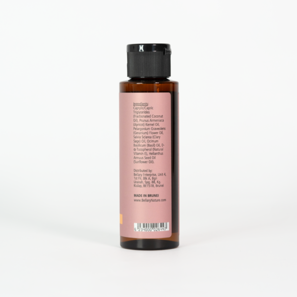Caprylic/Capric Triglycerides (Fractionated Coconut Oil), Prunus Armeniaca (Apricot) Kernel Oil, Pelargonium Graveolens (Geranium) Flower Oil, Salvia Sclarea (Clary Sage) Oil, Ocimum Basilicum (Basil) Oil, D-α-Tocopherol (Natural Vitamin E), Helianthus Annuus Seed Oil (Sunflower Oil).