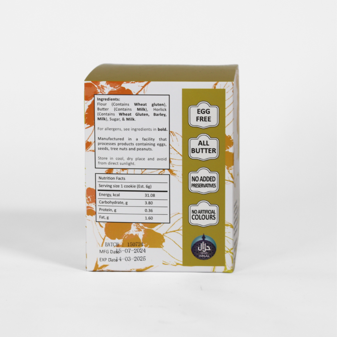 | Ingredients / Composition | Flour (contains wheat gluten), butter (contains milk), Horlicks powder (contains wheat gluten, barley & milk), white sugar & milk. |