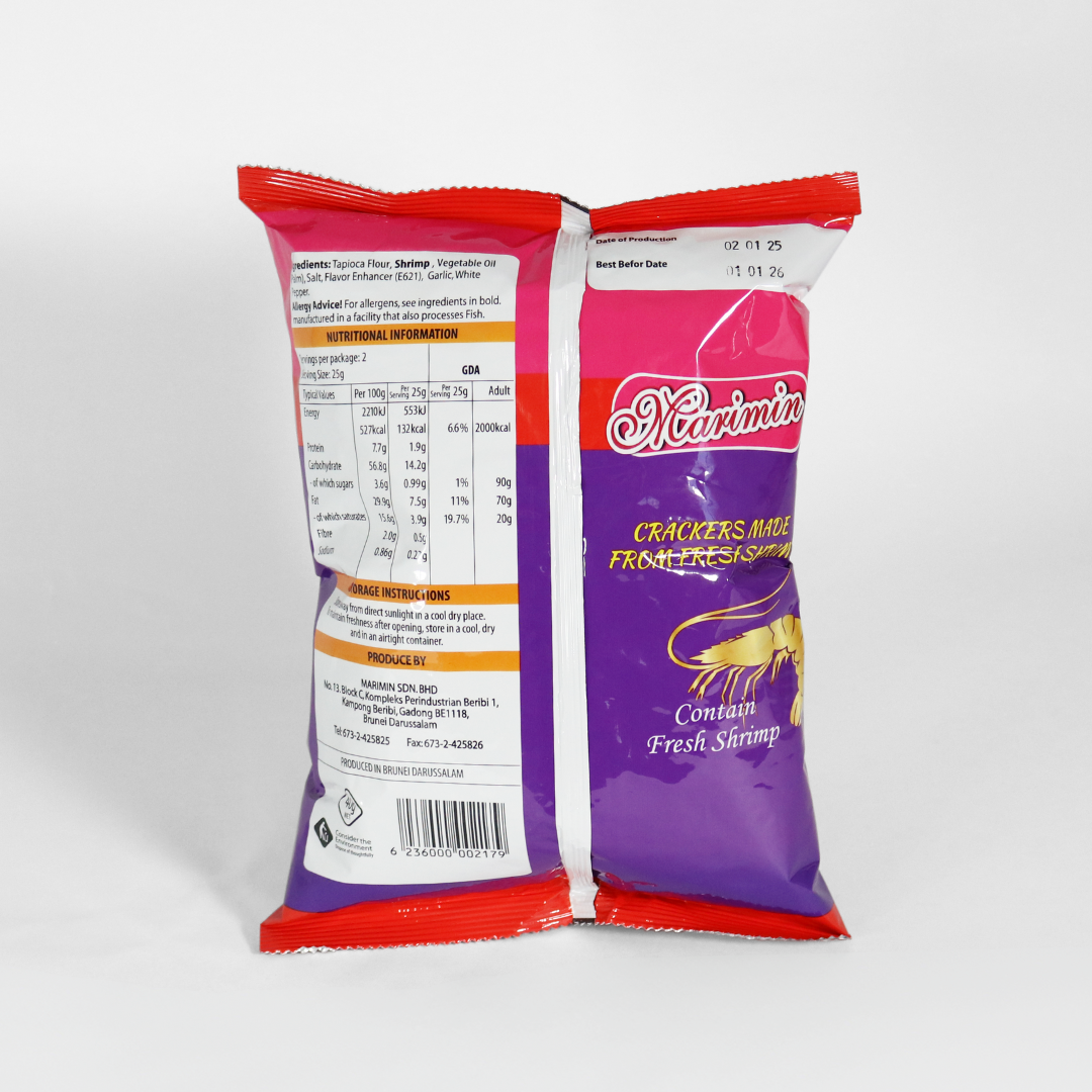 | Ingredients / Composition | Tapioca Starch, Shrimp Meat (41%), Vegetable Oil (Palm), Salt, Flavour Enhancer (E621), Garlic, White Pepper, Permitted Red Food Colouring (E122) |
