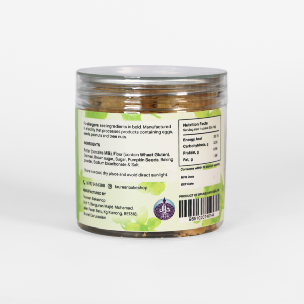 Flour (contains wheat gluten), butter (contains milk), oatmeal, brown sugar, white sugar, pumpkin seeds, baking powder, sodium bicarbonate & salt.