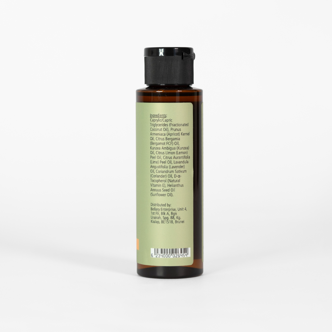 Caprylic/Capric Triglycerides (Fractionated Coconut Oil), Prunus Armeniaca (Apricot) Kernel Oil, Citrus Bergamia (Bergamot FCF) Oil, Kunzea Ambigua (Kunzea) Oil, Citrus Limon (Lemon) Peel Oil, Citrus Aurantifolia (Lime) Peel Oil, Lavandula Angustifolia (Lavender) Oil, Coriandrum Sativum (Coriander) Oil, D-α-Tocopherol (Natural Vitamin E), Helianthus Annuus Seed Oil (Sunflower Oil).