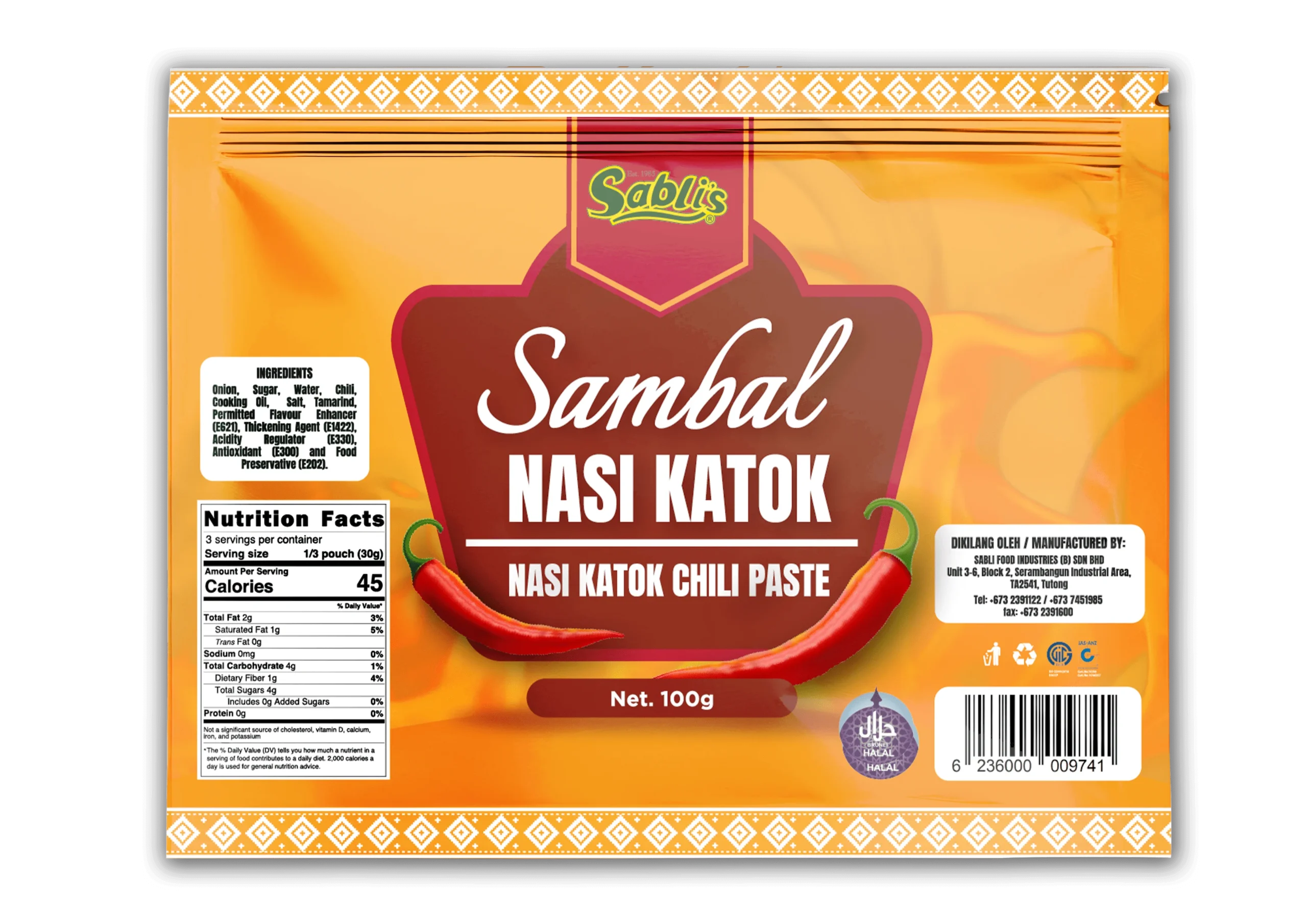Sabli’s Sambal Nasi Katok in pouch offers the authentic Bruneian nasi katok flavour with a milder heat level, making it suitable for all palates. Made from fresh chilies, garlic, onions, and Sabli’s signature seasoning, it delivers a balanced spicy-sweet taste without overwhelming heat, capturing the classic nasi katok profile perfectly. Its smooth texture and aromatic finish pair well with fried chicken, hot rice, and everyday meals. Conveniently packed in a hygienic and easy-to-use pouch, it ensures freshness, portability, and consistency for both home use and food service needs.