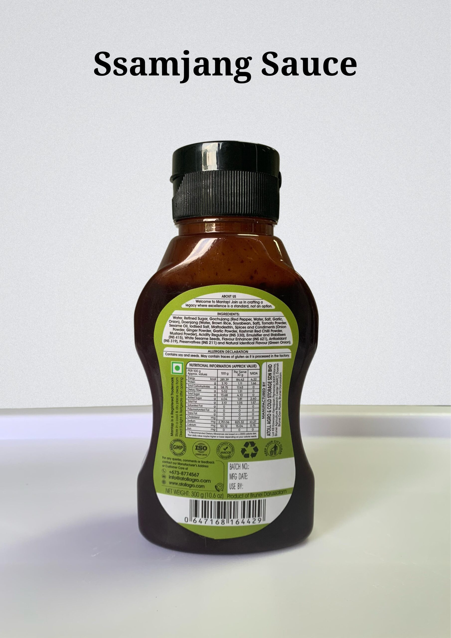 | Ingredients / Composition | Water, Refined Sugar, Gochujang (Red Pepper, Water, Salt, Garlic, Onion), Doenjang (Water, Brown Rice, Soyabean, Sait), Tomato Powder, Sesame Oil, lodised Salt, Maltodextrin, Spices and Condiments (Onion Powder, Ginger Powder, Garlic Powder, Kashmiri Red Chilli Powder, Mustard Powder), Acidity Regulator (INS 330), Emulsifier and Stabilisers (INS 415), White Sesame Seeds, Flavour Enhancer (INS 621), Antioxidant (INS 319), Preservatives (INS 211) and Natural Identical Flavour (Green Onion). |