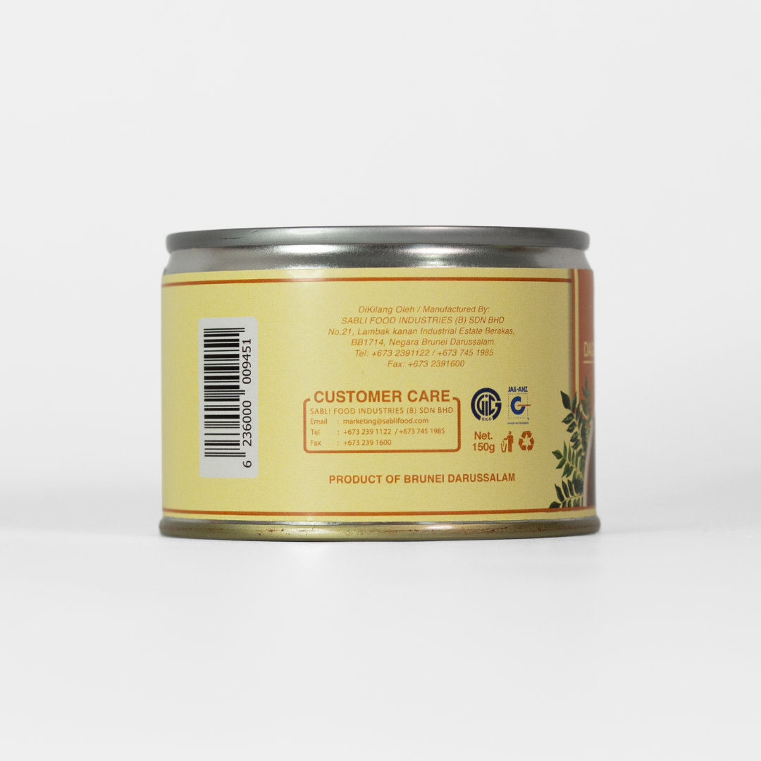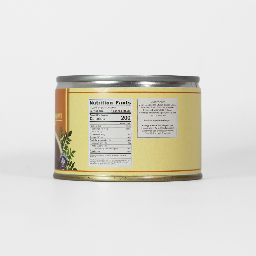 | Ingredients / Composition | Meat, Cooking Oil, Ciliboh, Onion, Tumeric, Tamarind, Shallot, Garlic, Permitted Flavour Enhancers (E621), Permitted Thckening Agent (E1422), Sugar, Salt, Lemongrass, Tumeric Leaves and Permitted Thickening Agent (E407) |